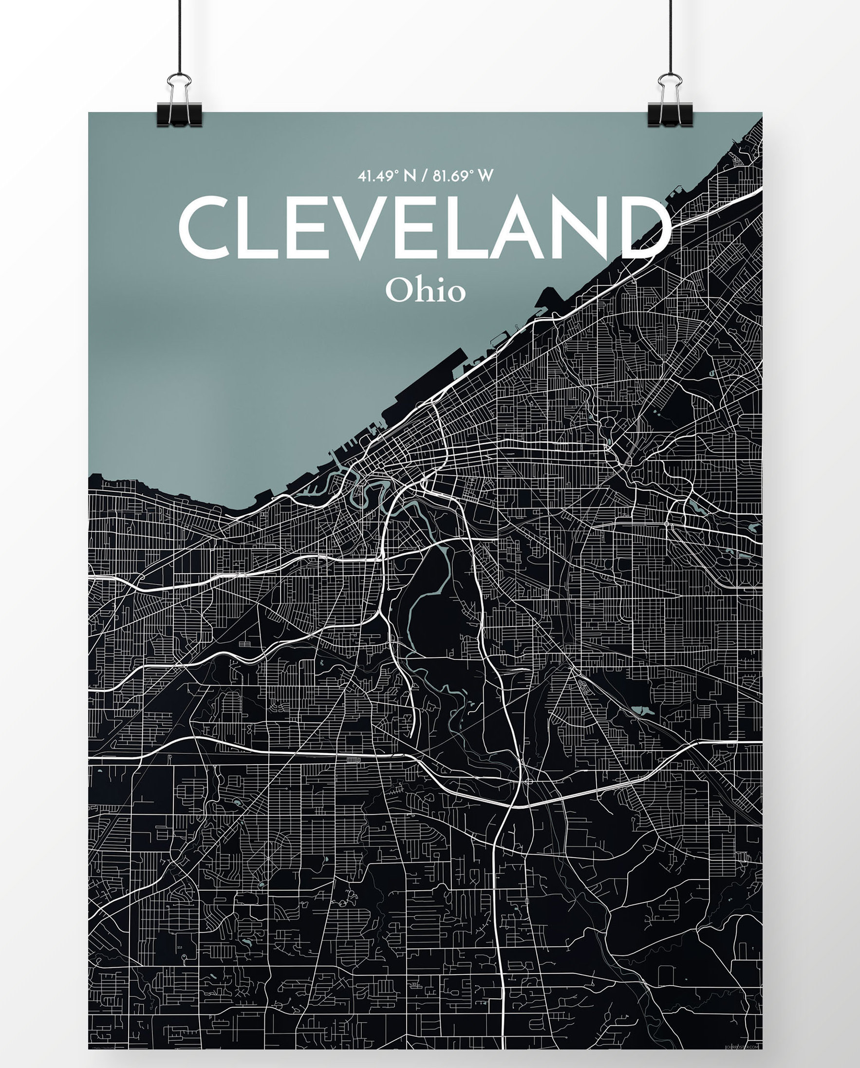 Cleveland City Map of Ohio, USA Hope Poster by deMAP Cleveland city. Cleveland is a culturally diverse city on the shores of Lake Erie, one of the Great Lakes, in Cuyahoga County, Ohio, USA Cleveland is the second largest city in the state of Ohio, with a population of around 385 thousand people, and it is known for its rich history, diverse culture, and thriving economy